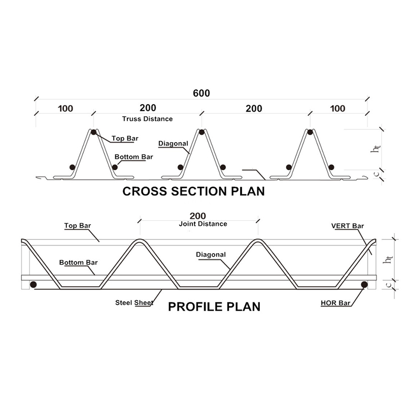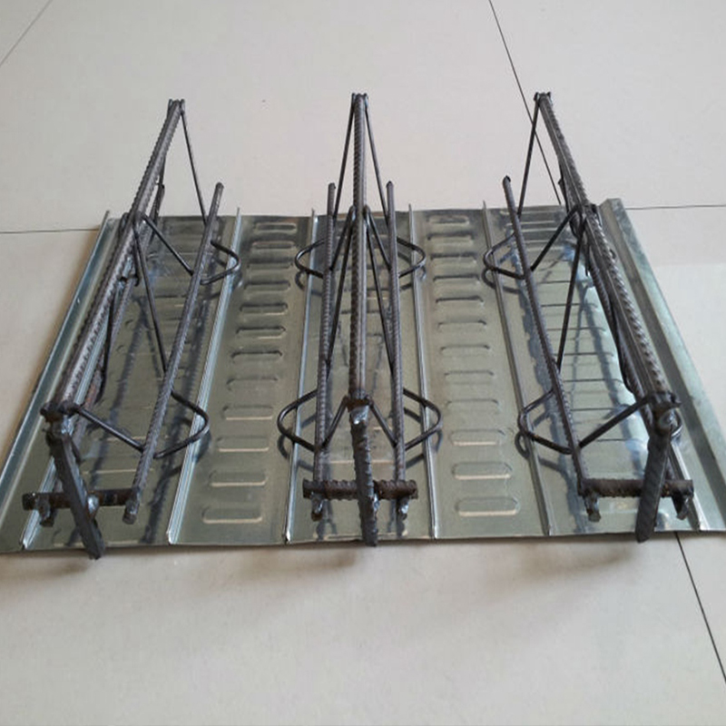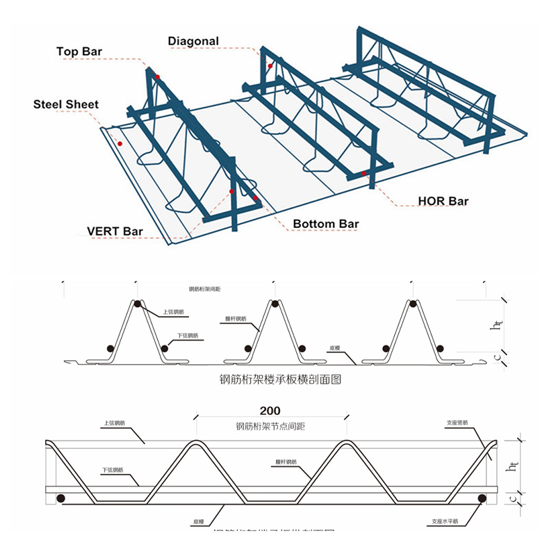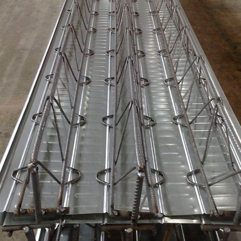 Hoja de acero inferior: proporciona forma de trabajo durante la colocación del concreto y contribuye a la resistencia al corte. Barras de acero: soldadas a la lámina de acero, estas armaduras triangulares (típicamente con barras de 6 a 12 mm de diámetro) mejoran la resistencia a la tracción y la rigidez. Tomada de concreto: se integra con el sistema de armadura para formar una losa compuesta, con espesores que varían de 100–200 mm.